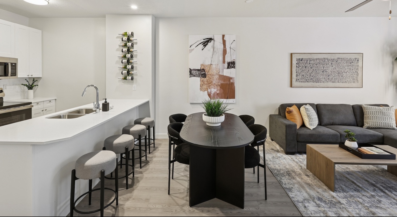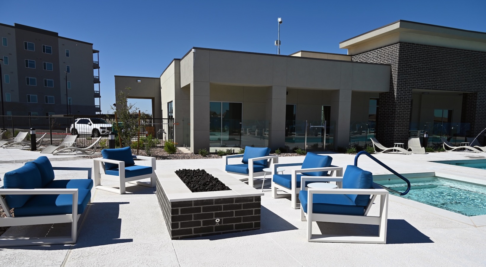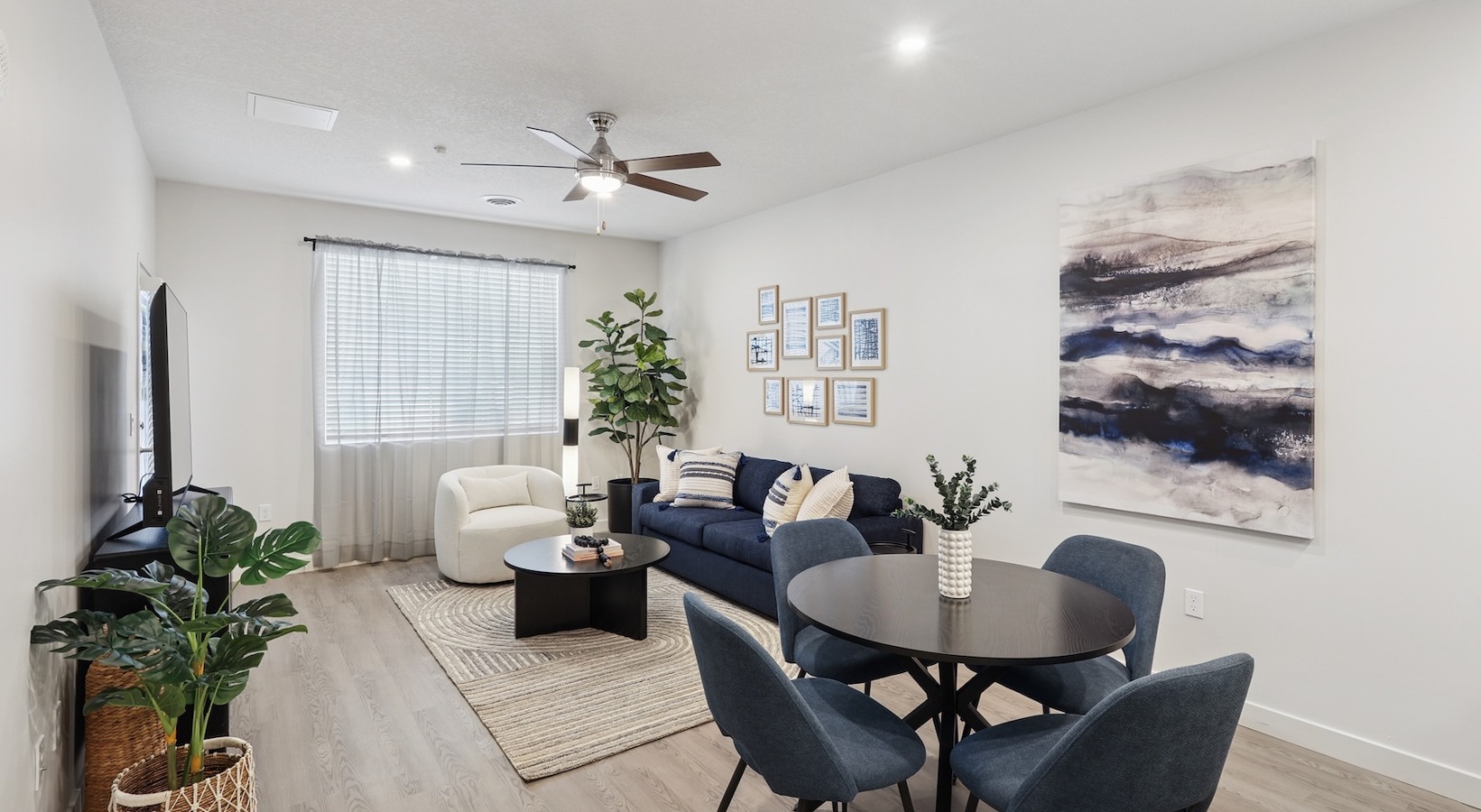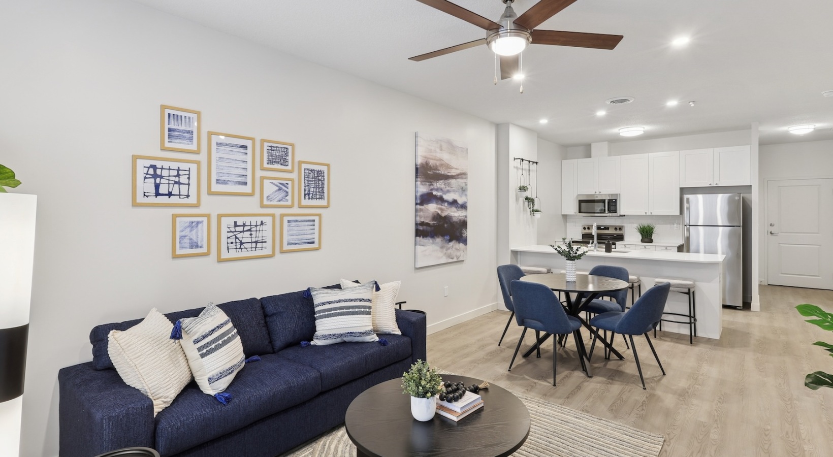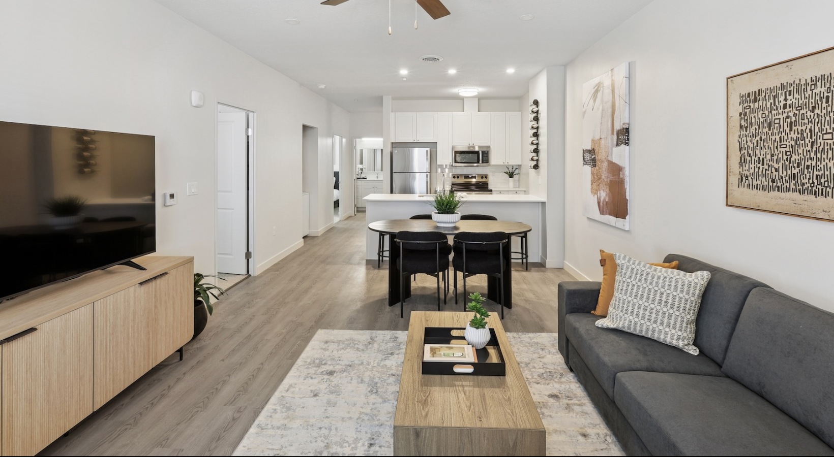 Open space living area with natural lighting the exterior of a building the exterior of a building at aerial viewing an advertisement a group of people in a large room a collage of images and the exterior of a building